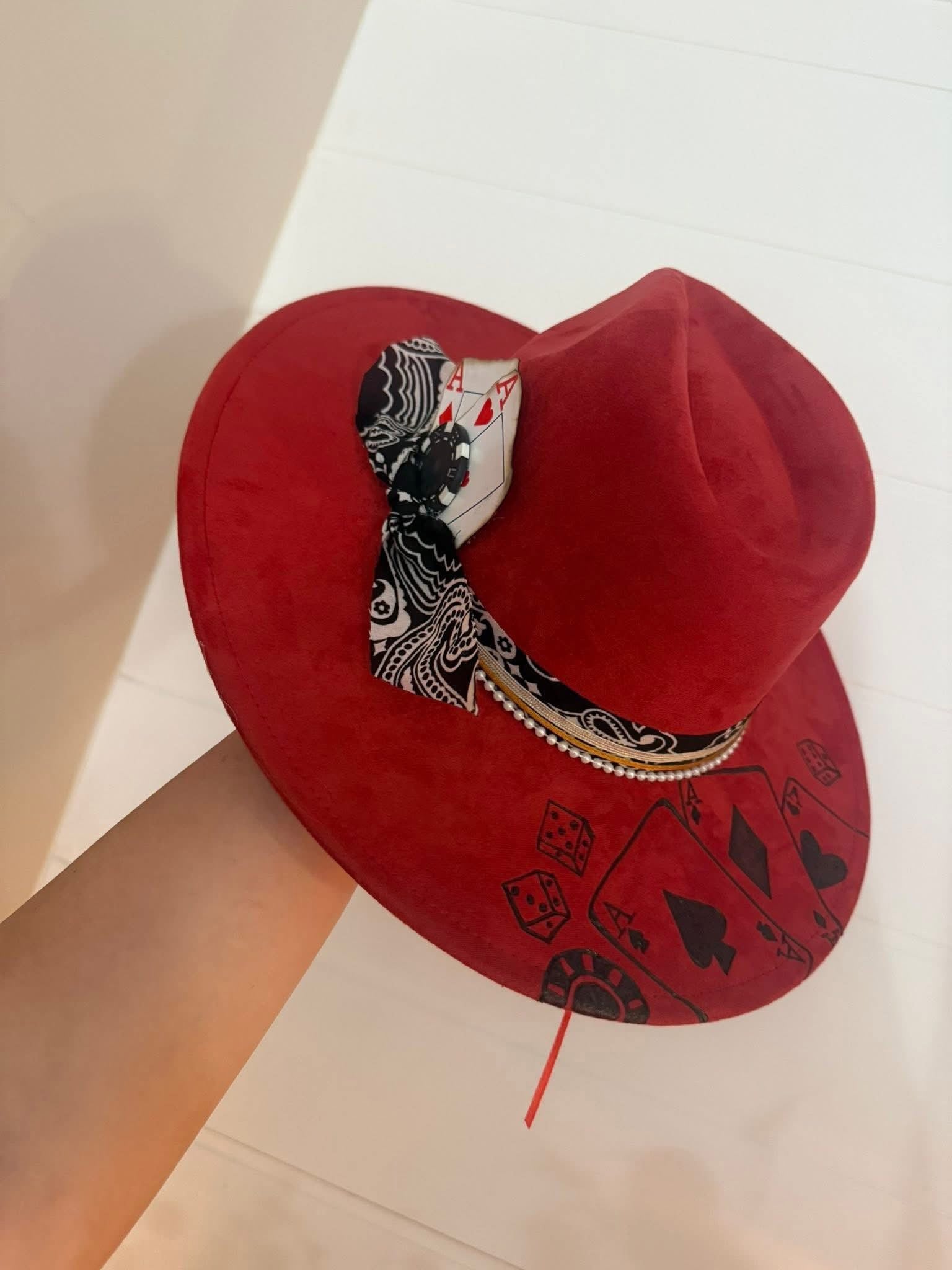 Get ready to raise the stakes with the Ace of Brims! This fiery red hat, perfect for high rollers and casual card sharks alike, features burned playing cards and poker chips—talk about a hot hand! Wear it at the tables or to spice up your game night; either way, you'll look like a winning bet!