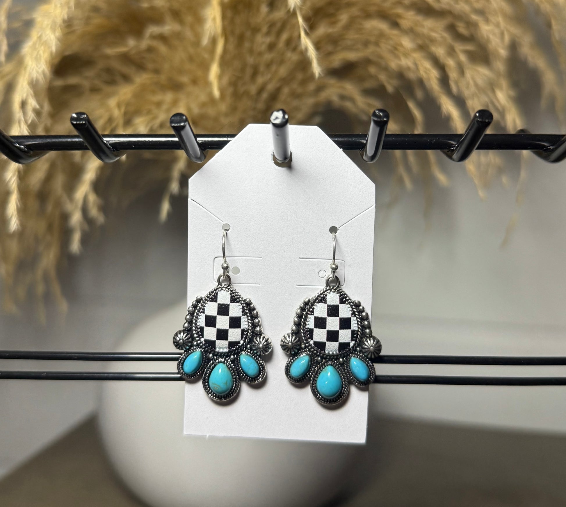 Dangle these playful checkered earrings with black and white stripes and turquoise accents for an addition to any outfit. Add a touch of fun and style with these unique earrings that are sure to stand out. (Double pun points for "check"-ing out these earrings!)