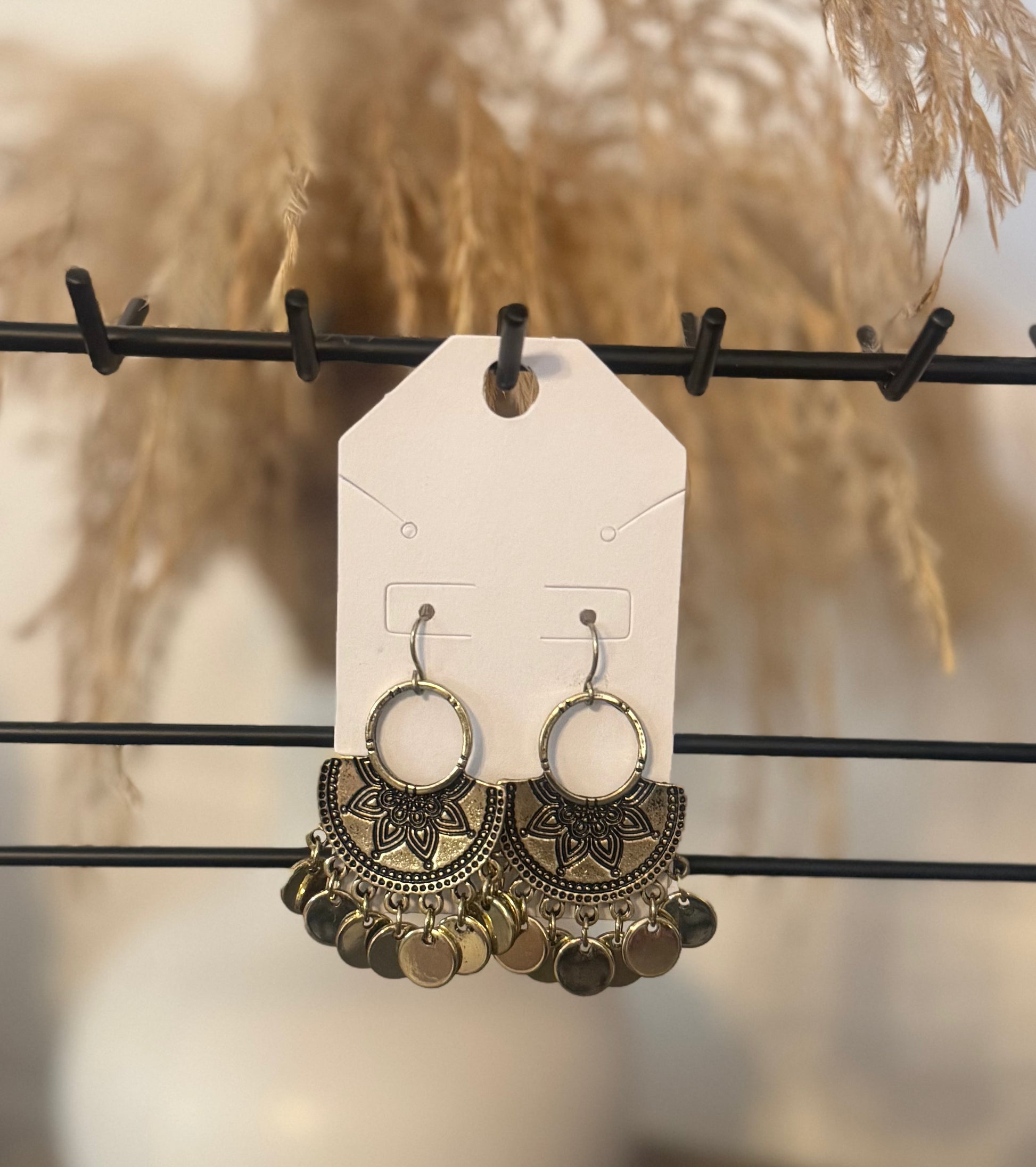 Add some glimmer to your look with Dusty Trail Dangles, featuring golden bronze earrings with playful coin dangles. Perfect for upgrading any outfit with a touch of whimsy. Shine bright and turn heads with these unique dangles.