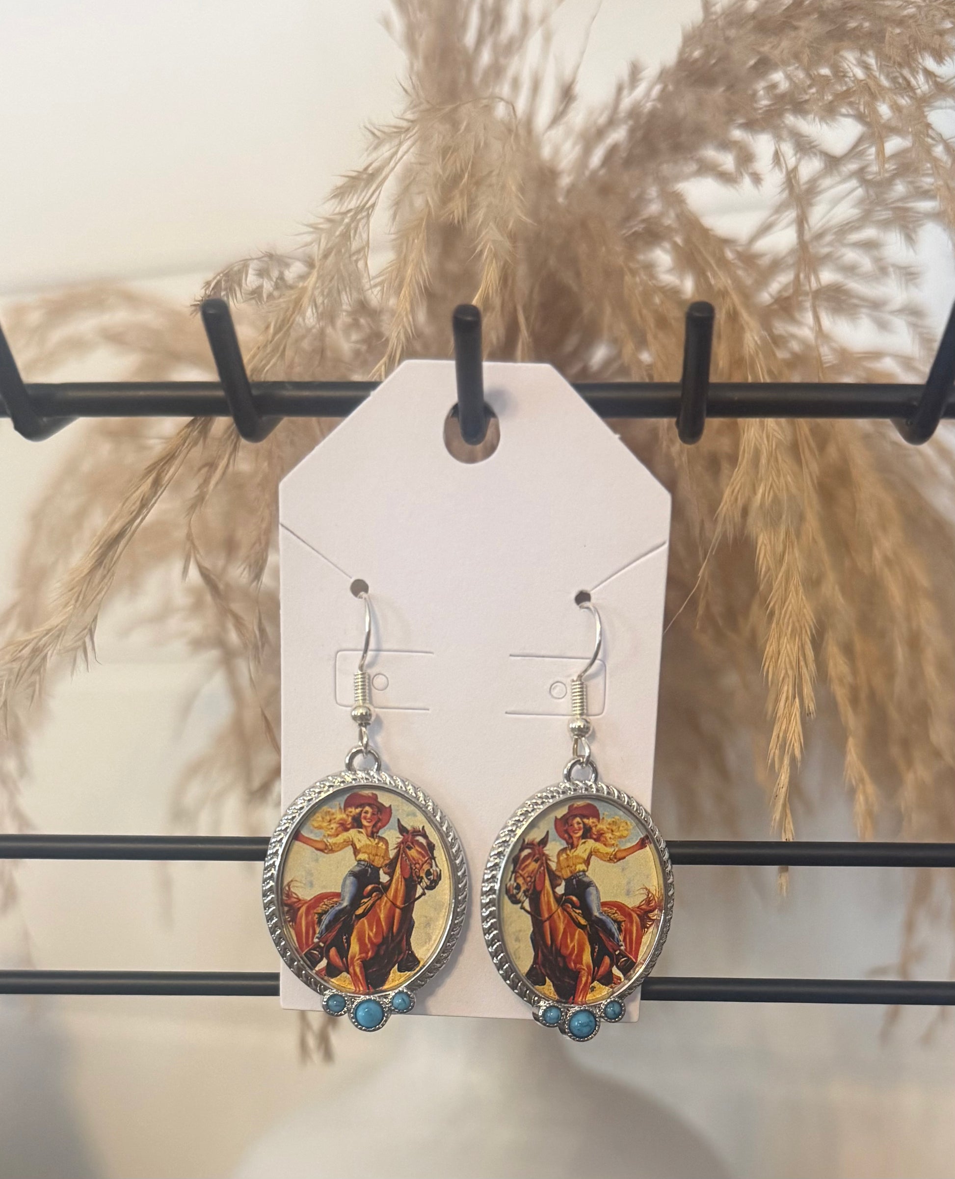 Giddy up your earring game with the Golden Mane Cowgirl! These playful earrings feature a blonde cowgirl riding a horse, accented with a pop of turquoise. Get ready for a wild ride of style!
